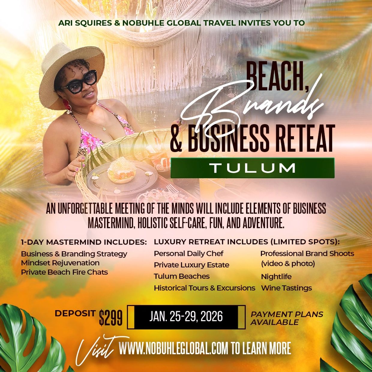 Ari Squires in partnership with Nobuhle Global Travel Planners, invites YOU to TULUM, MEXICO for a once in a lifetime mastermind experience coupled with top tier 5 star luxury accommodations with a personal chef and maid service in your own private estate.